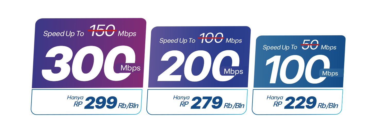 - Promo berlaku untuk pelanggan akuisisi baru pada periode 19–31 Desember, khusus untuk paket Family, dan SuperUser dengan kecepatan 100/150 Mbps. Pelanggan akan mendapatkan double speed booster selama 6 bulan, sehingga kecepatan meningkat menjadi 200/300 Mbps sesuai paket yang dipilih.