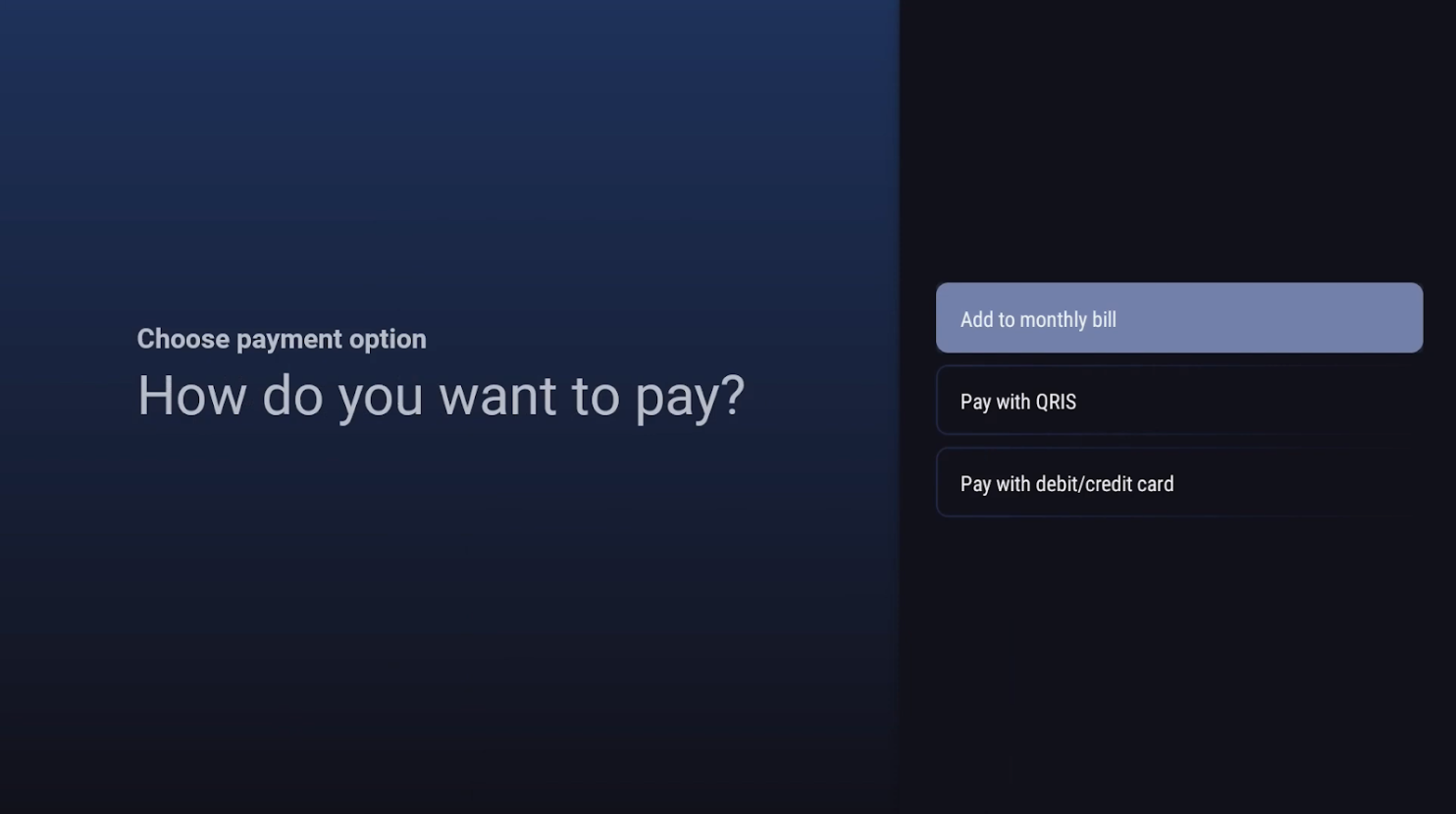 - Jika memilih metode pembayaran Multi Payment, Anda dapat memindai kode QR yang muncul di layar TV dengan aplikasi pembayaran digital atau aplikasi bank. Selesaikan pembayaran dengan mengikuti instruksi yang tertera di aplikasi Anda.