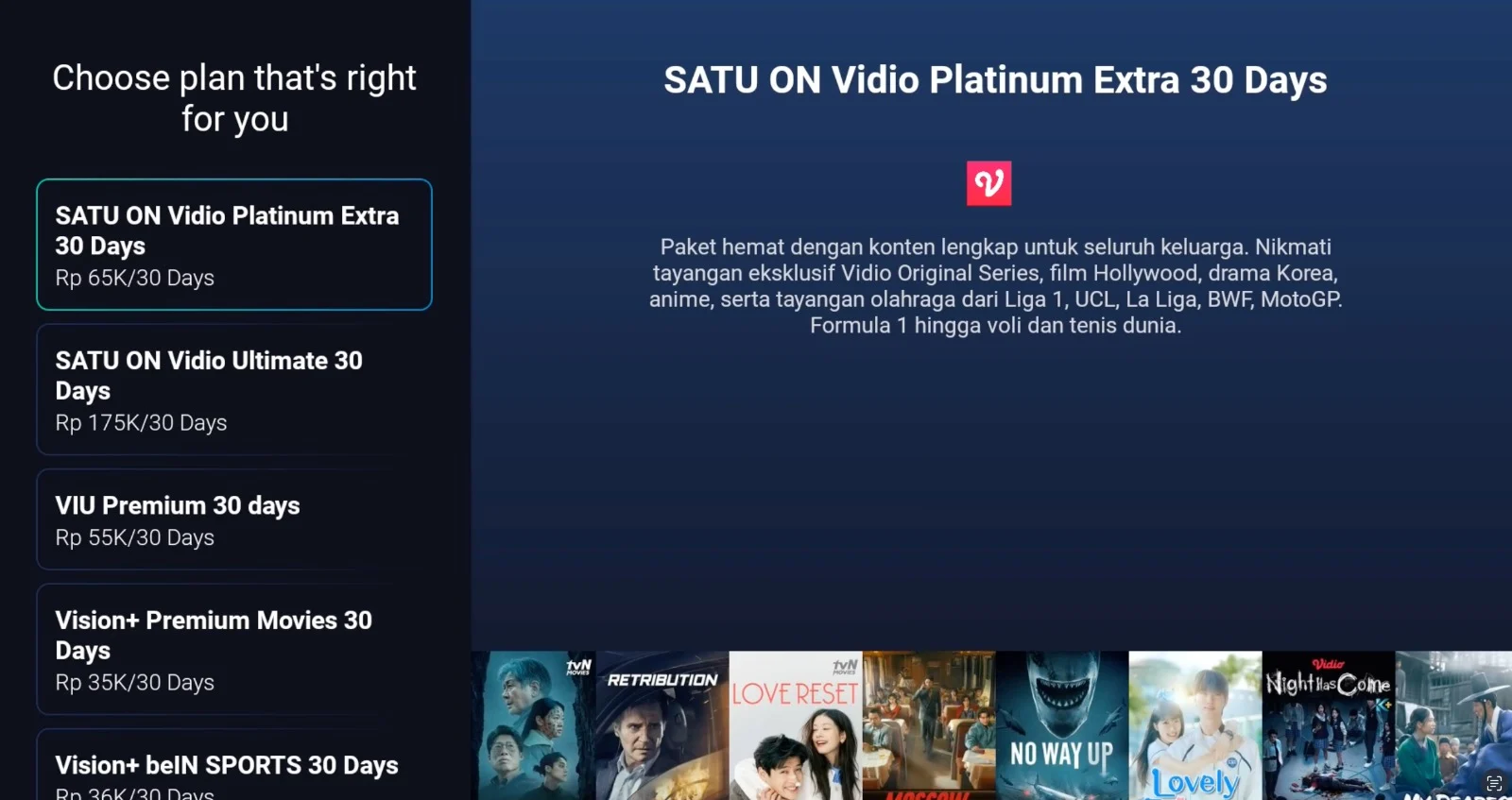 - SATU ON CORE (Vidio, Vision+, Viu): Rp104.000