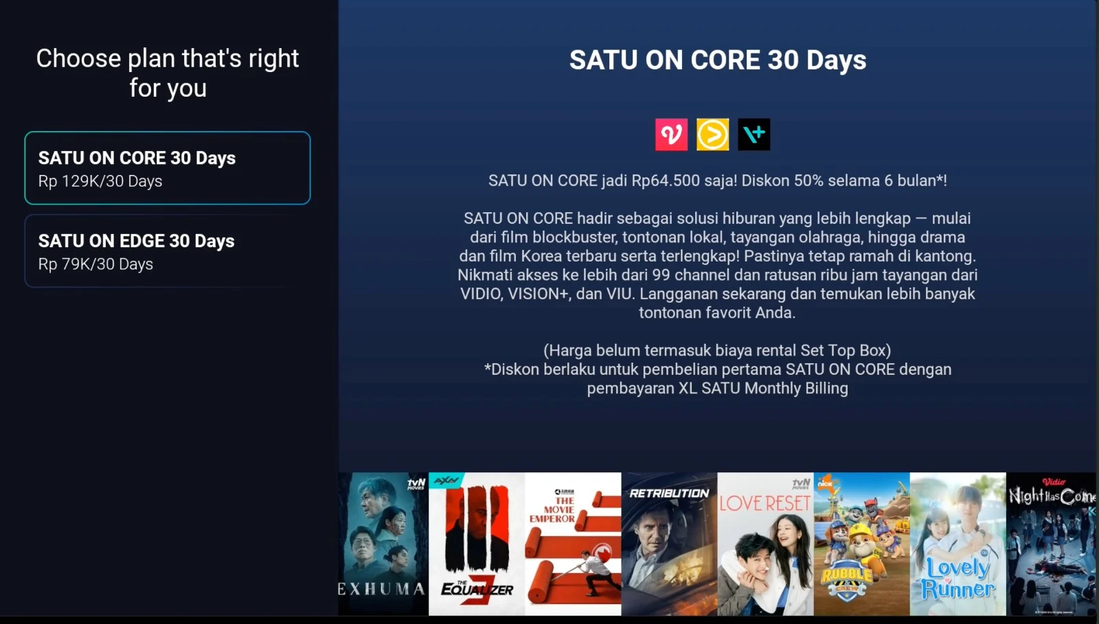 SATU ON kini hadir dengan Paket SATU ON EDGE, SATU ON CORE, dan SATU ON STELLAR dengan Add-On perangkat STB XL SATU Entertainment. Dengan biaya langganan mulai dari Rp 79.000 per bulan (belum termasuk biaya berlangganan STB), Anda dan keluarga sudah dapat menyaksikan berbagai konten di Vidio, Vision+, Viu, Disney+ atau siaran TV nasional dan internasional lainnya.